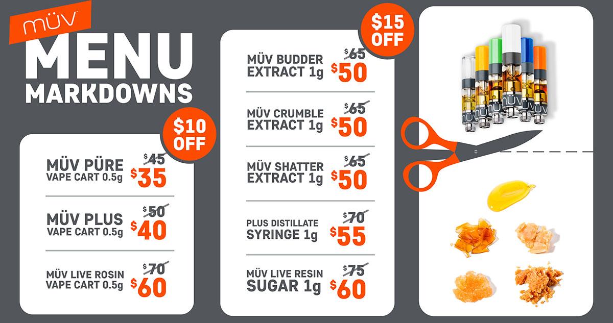 The MÜV Menu is being marked down. Save $15 on select cannabis concentrates and $10 on select cannabis vapes!